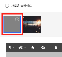참고: 새로운 슬라이드를 클릭해, 슬라이드를 추가하거나, 슬라이드 썸네일 상단의 ⨂를 클릭해 삭제합니다.