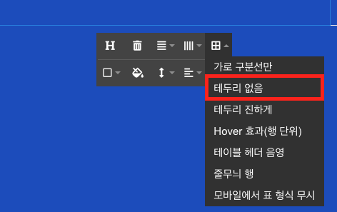 아래 그림처럼 테이블 옵션 메뉴가 나오면, 표 스타일 옵션에서 테두리 없음 을 선택합니다.