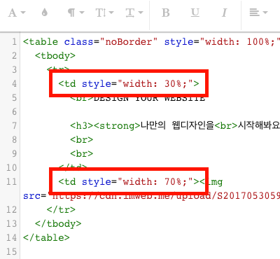 <td> 태그의 width 값을 변경합니다. 이 도움말에서는 왼쪽 열의 크기를 30%, 오른쪽 열의 크기를 70%로 수정했습니다. 텍스트 및 이미지 크기에 따라 적절하게 조절합니다.