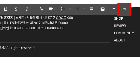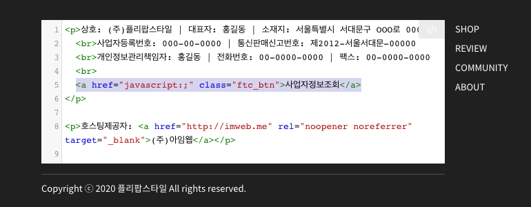 이 도움말에서는 방문자가 쇼핑몰 운영자의 사업자정보 및 통신판매업신고 정보를 확인할 수 있도록 웹사이트 하단에 사업자정보조회 링크를 추가하는 방법을 설명합니다.