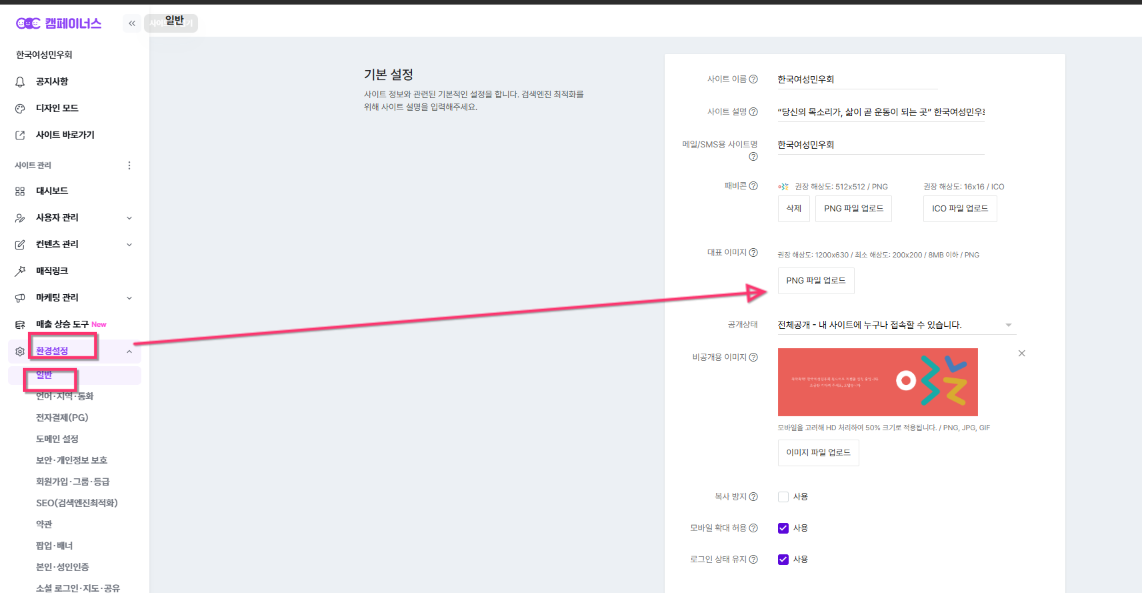 관리자 모드>환경설정>기본 설정> 대표 이미지 >PNG 파일 업로드를 클릭합니다.권장 해상도: 1200x630 / 최소 해상도: 200x200 / PNG