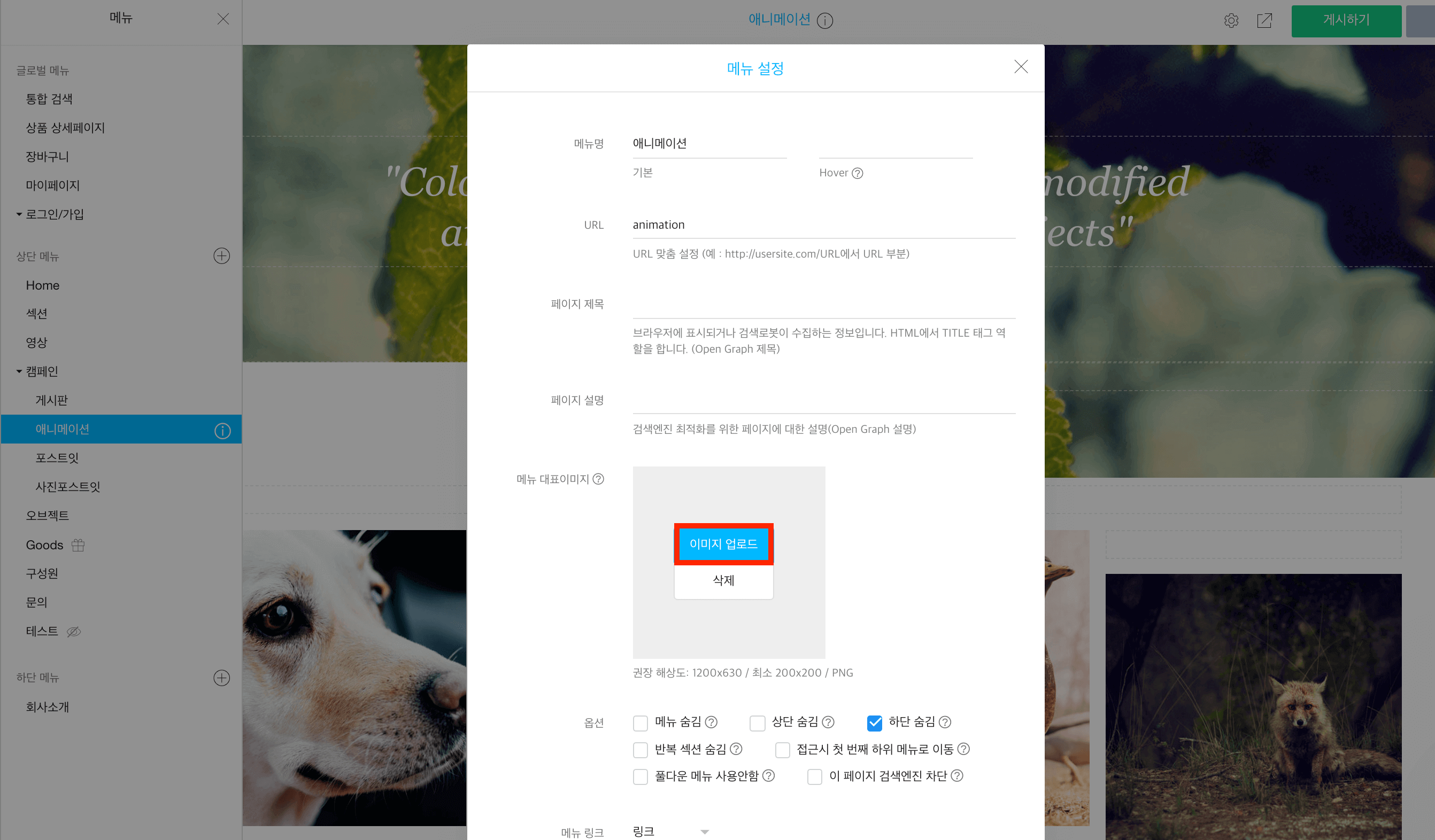 메뉴 설정 창에서 메뉴 대표 이미지로 이용할 이미지를 업로드합니다.