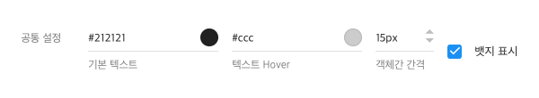 공통으로 적용할 텍스트 색상 및 텍스트 Hover색상을 편집합니다. 필요에 따라 객체간 간격을 조절해 버튼간 간격을 조절해 보세요.