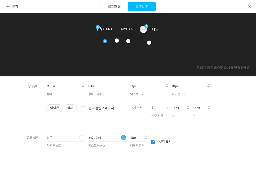 (선택 사항) 로그인/장바구니 위젯을 마우스로 클릭하고 드래그하여, 원하는 곳에 배치합니다.