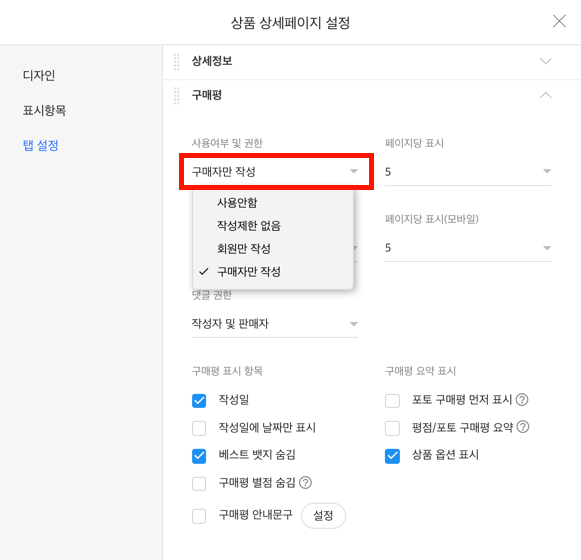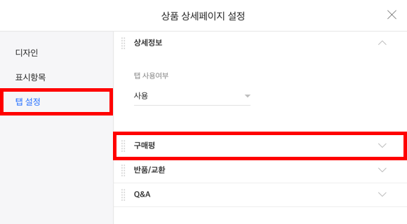 왼쪽 탭에서 탭 설정을 클릭하고, 구매평 항목을 클릭합니다.