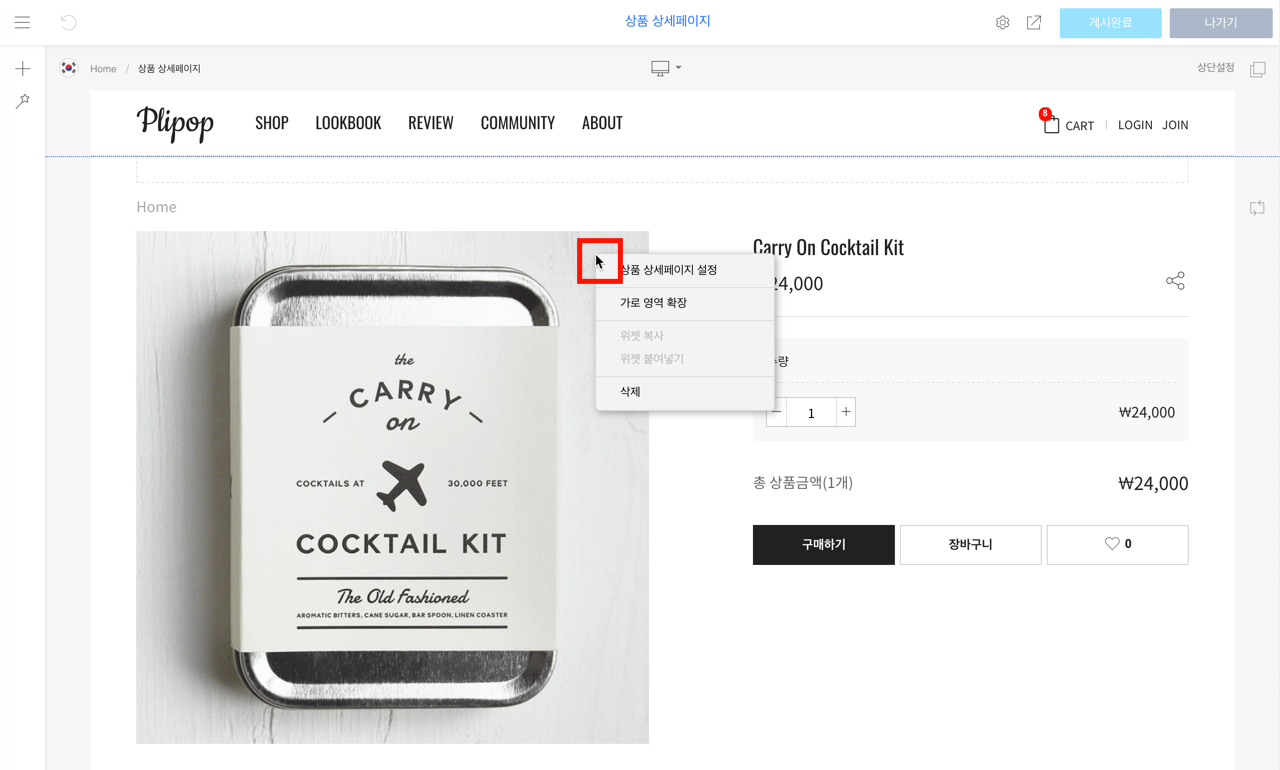 상품 상세페이지 위젯에 마우스 포인터를 올리고, 마우스 오른쪽 버튼을 클릭합니다.