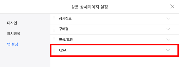 왼쪽 탭에서 탭 설정을 클릭하고, Q&A 항목을 클릭합니다.