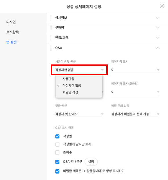 상품 상세페이지에 표시되는 구매평 및 Q&A 기능의 사용여부 및 작성 권한을 설정할 수 있습니다. 구매평 및 Q&A 기능이 필요 없는 경우 사용안함을 선택하여 끌 수 있으며, 필요에 따라 누구나 작성하도록 작성제한을 풀 수도 있습니다.