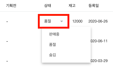 상태 항목에서 원하는 상태(판매중, 품절, 숨김)로 변경합니다.
