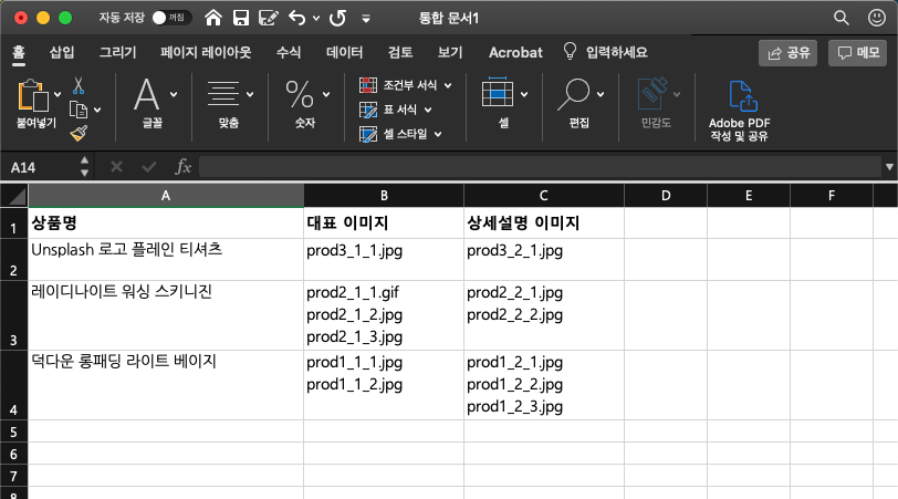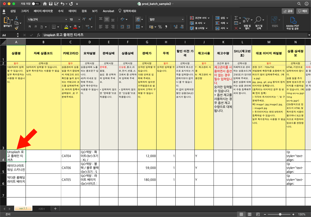 위 2단계에서 내려받은 샘플 엑셀 파일(prod_batch_sample.xlsx)을 엽니다.