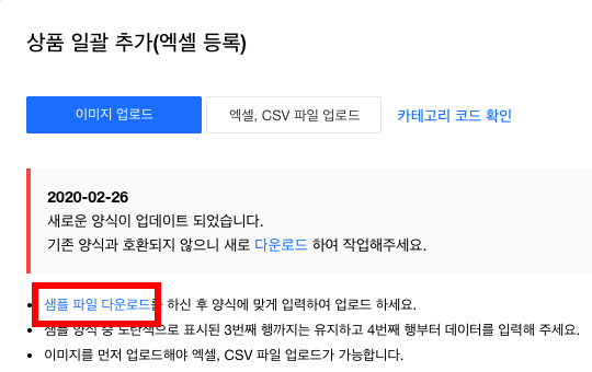 내 사이트 관리자 페이지에 접속해 샘플 엑셀 파일을 내려받습니다.