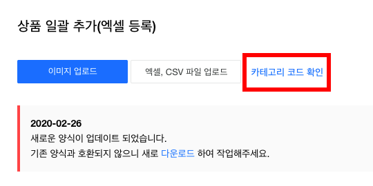 참고: 카테고리ID의 경우 상품 일괄 추가 창에서 카테고리 코드 확인을 클릭해 알아볼 수 있습니다.