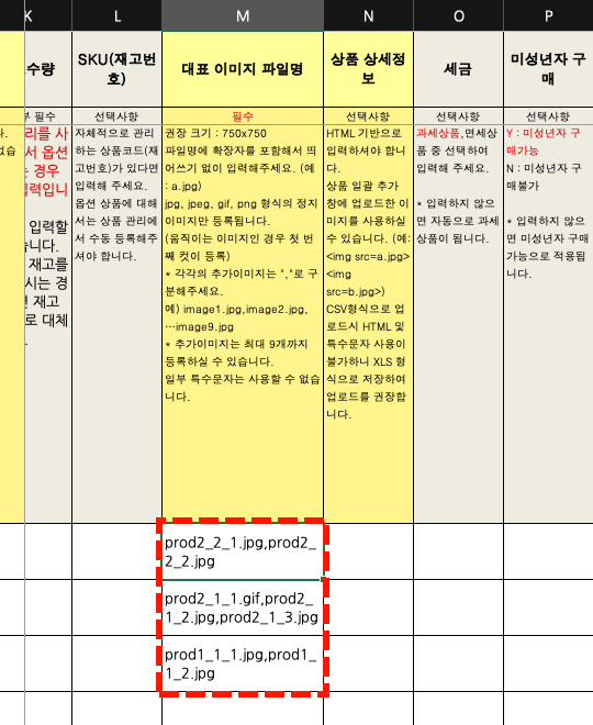 상품 정보 입력 중 대표 이미지 파일명 열에는 위 1단계에서 편집한 파일명을 순서대로 상품에 맞춰 입력합니다.