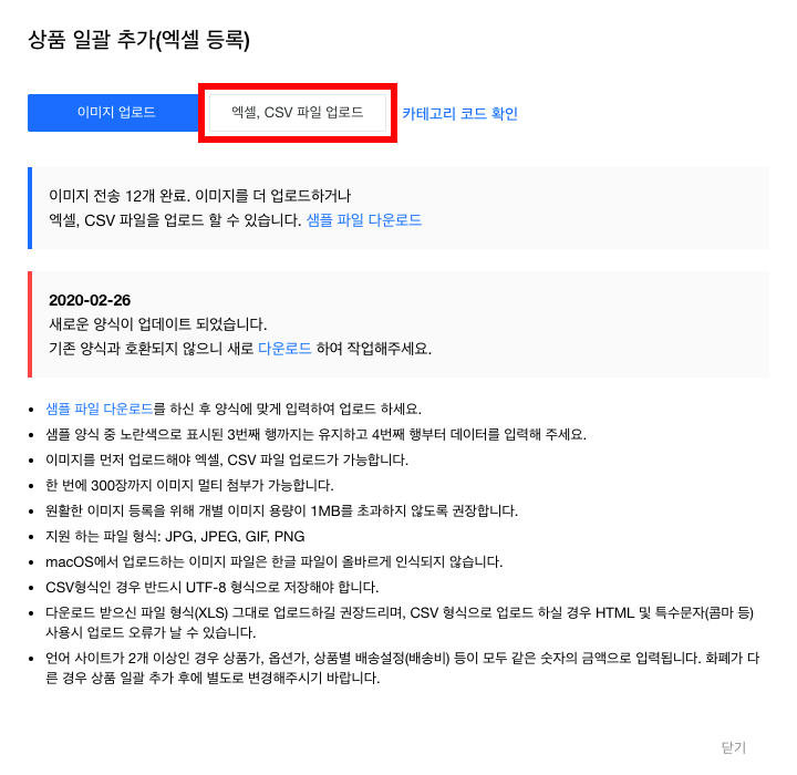 이미지 업로드가 완료되면, 편집한 상품 엑셀 파일을 올립니다.