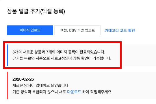 아래 그림처럼 새로운 상품 및 이미지가 정상적으로 등록 완료되었음을 알리는 메시지가 나타납니다.