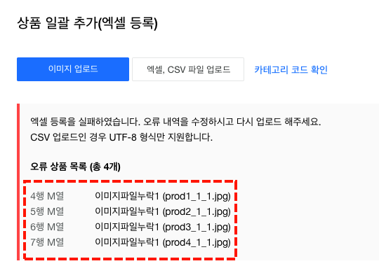 (선택 사항) 아래 그림과 같이 엑셀 등록 실패 오류 메시지가 나타날 수 있습니다. 오류 내용을 참조하여 필요한 항목을 수정하고 다시 업로드해 주세요.