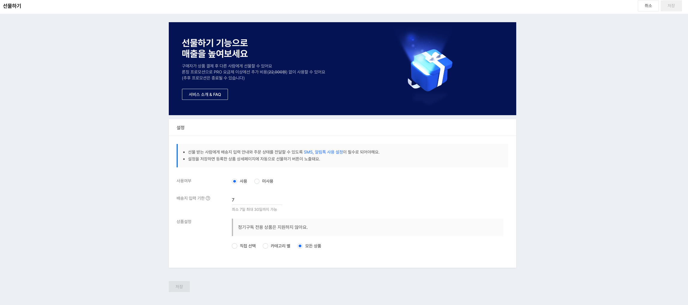 선물하기를 적용할 상품과 자동 취소일을 설정합니다.