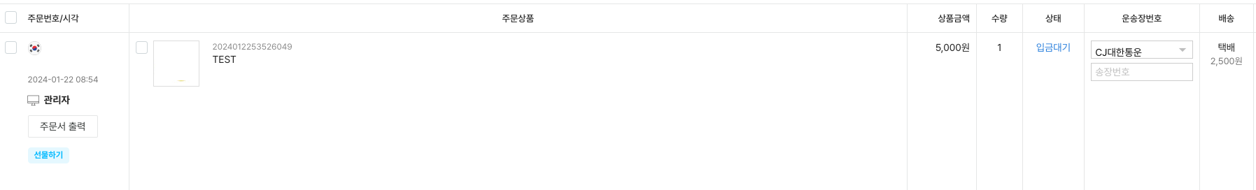 선물하기 기능을 설정하면, '배송지 입력대기' 탭이 생성됩니다.