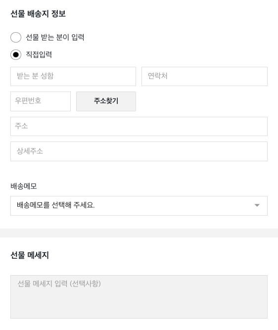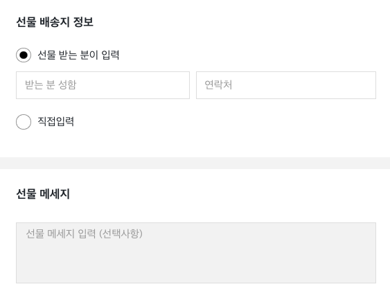 구매자가 상품 구매 시, 선물 받을 주소를 직접 입력합니다.