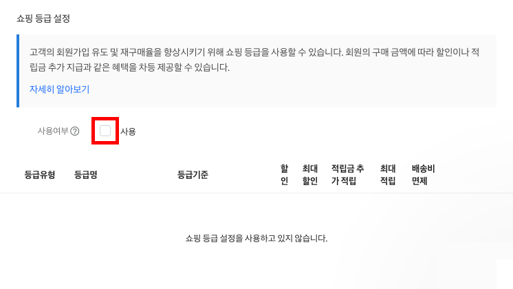 고객의 회원가입 유도 및 재구매율을 향상시키기 위해 쇼핑등급 기능을 사용할 수 있습니다. 회원의 구매 금액에 따라 할인, 적립금 추가 지급, 무료 배송과 같은 혜택을 차등 제공할 수 있습니다.