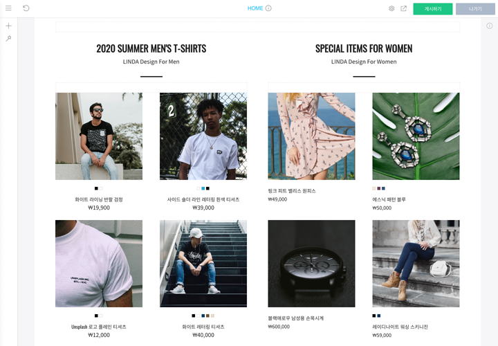 쇼핑 기획전 위젯은 쇼핑 위젯과 달리 하나의 페이지에 여러 개의 위젯을 추가할 수 있습니다. 만약 아래의 그림처럼 하나의 페이지에 여러 종류의 기획 상품들을 표시하려는 경우 쇼핑 기획전 위젯을 사용해 보세요.