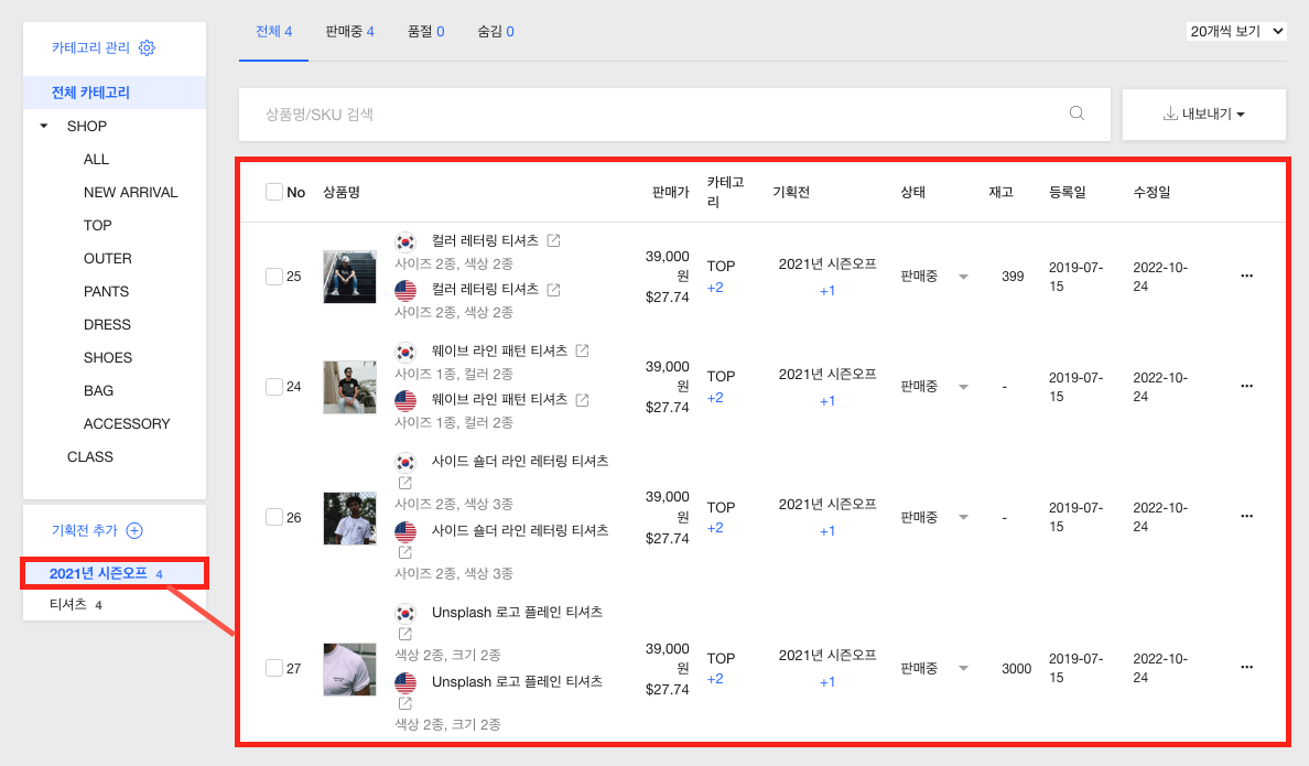 기획전이란 카테고리에 상관없이 사용자가 직접 지정한 상품들만 모아 판매할 때 유용하게 활용할 수 있는 기능입니다. 예를 들어 여름철에 인기 있는 상품만을 모아 보여주거나, 블랙 프라이데이를 위한 특별 할인가가 적용된 상품만을 모아 보여줄 수 있습니다.