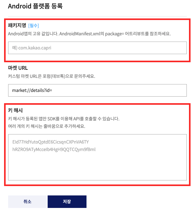 위 1단계에서 복사한 패키지명과 해시키(키 해시) 값을 입력합니다.
