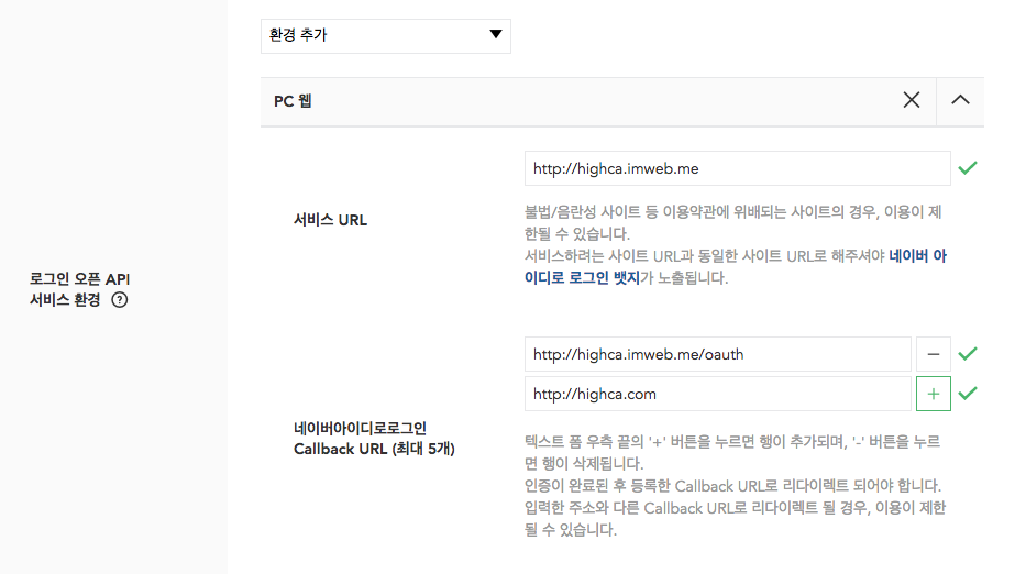 로그인 오픈 API 서비스 환경에서 네이버 아이디로 로그인 Call Back URL 부분의 + 버튼을 클릭해 URL을 추가합니다.