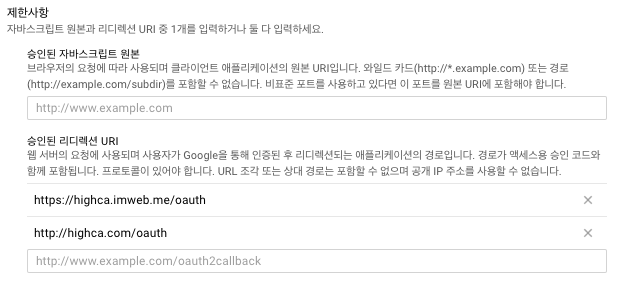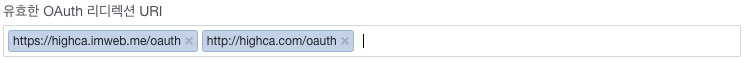 승인된 리디렉션 URI에 아래 화면과 같이 내 도메인을 추가합니다.주의: 도메인 뒤에 /oauth를 반드시 추가 입력해야 합니다.