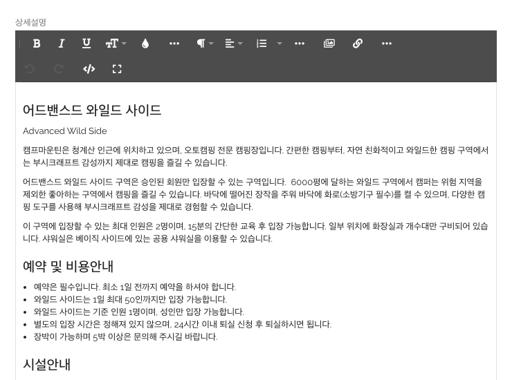 텍스트, 이미지, 동영상 등을 사용해 예약 상품에 관한 기본 정보를 작성하고, 판매자의 강점, 상품의 매력 등 구매자에게 필요한 상세 설명을 작성합니다.
