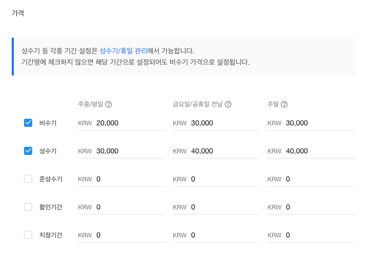 비수기, 성수기 등 기간에 따라 주중/평일, 금요일/공휴일 전날, 주말의 가격을 별도 지정할 수 있습니다.
