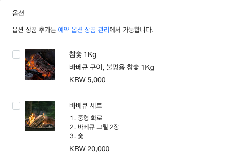 바베큐, 캠프파이어, 놀이시설 등 추가적인 옵션 상품을 등록하는 경우 사용합니다. (이 기능을 사용하려면 예약 옵션 상품 관리를 클릭해 옵션 상품을 미리 등록해야 합니다.)
