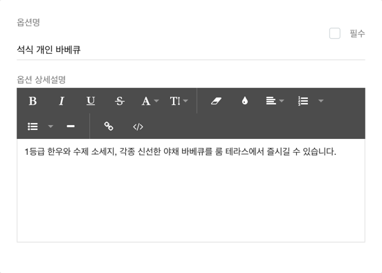 예약 옵션 상품 등록하기예약 상품 등록 시 본 예약 상품 외 바비큐, 캠프파이어, 놀이시설 등 추가적인 옵션 상품을 등록할 수 있습니다. 옵션은 여러 개 추가하고 관리할 수 있습니다.