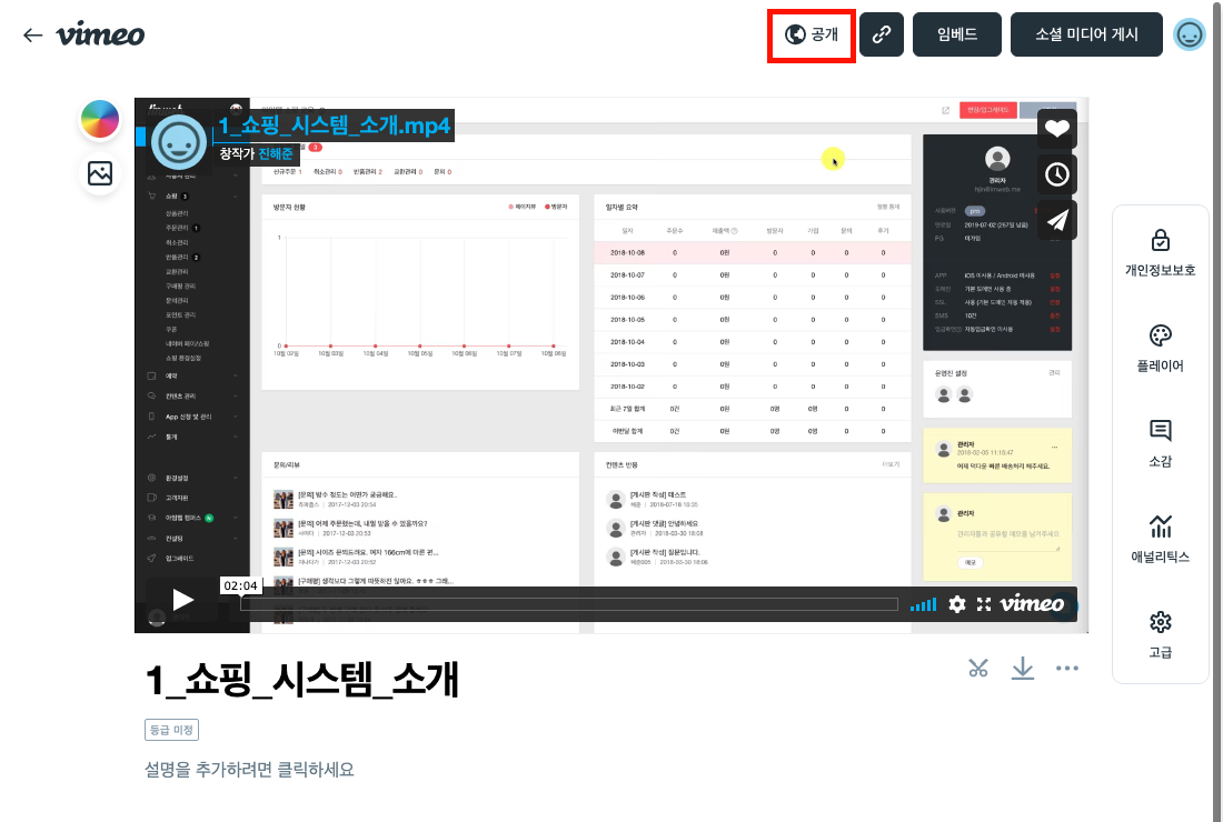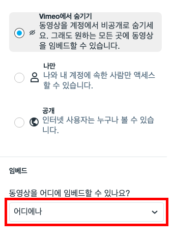 공개: 동영상이 Vimeo에 노출되며, 내 사이트에서 누구나 동영상을 볼 수 있습니다.