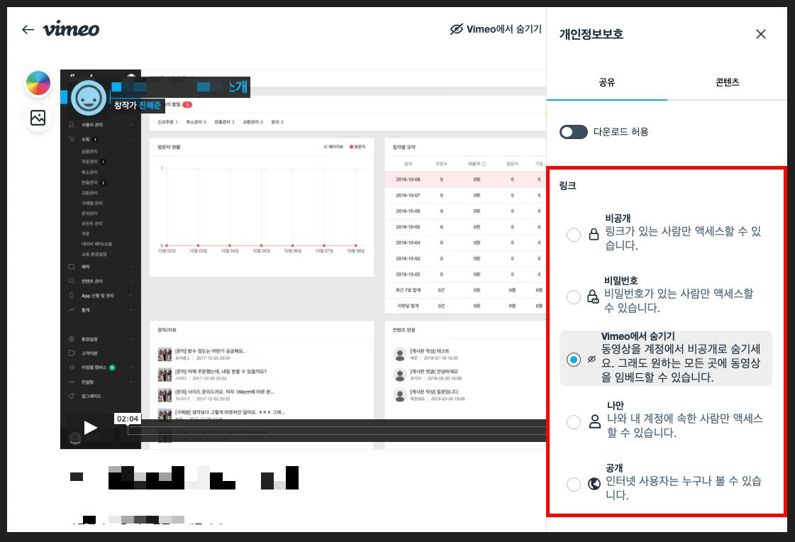 브라우저 오른쪽에서 개인정보보호 설정 패널이 나오면, 내 사이트에서 동영상이 재생되도록 링크 옵션을 비밀번호, Vimeo에서 숨기기, 공개 중 하나로 선택합니다.