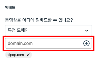 임베드 항목에서 동영상을 어디에 임베드할 수 있나요 옵션을 클릭하고, 특정 도메인을 선택합니다.