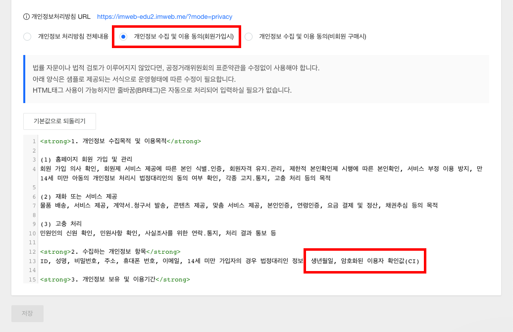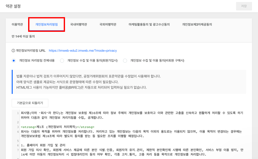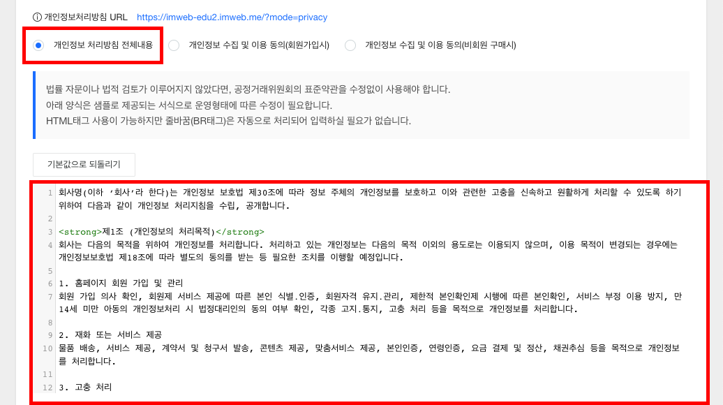 내 사이트에서 수집하고 처리하는 개인정보처리방침에 관한 항목 또는 조항을 추가/수정합니다.