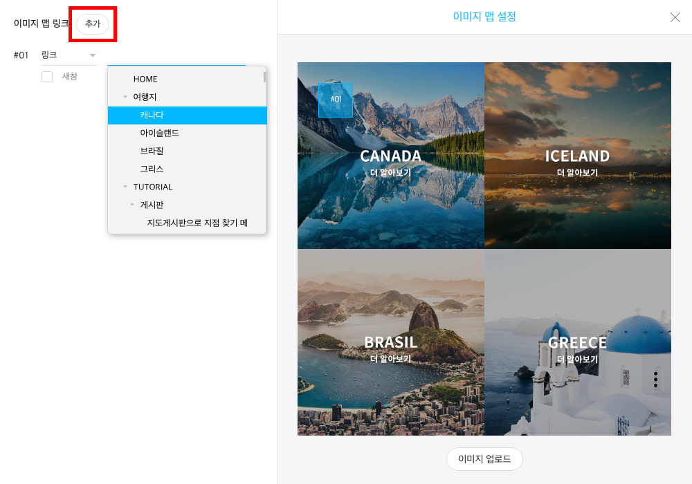 이미지맵 설정 창 왼쪽 상단의 추가 버튼을 클릭합니다. 새 링크가 나오면 링크 방식을 선택하고, 이동할 메뉴를 선택합니다. 링크는 추가 버튼을 다시 클릭해 여러 개 추가할 수 있습니다.
