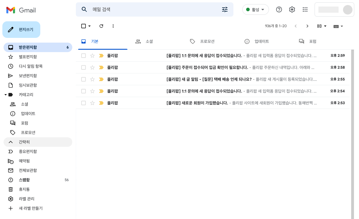 위 3~5단계에서 설정한 상황(회원가입, 주문, 게시판 작성 등)을 테스트로 진행하면 소유자(운영진 그룹)와 회원에게 자동 메일이 발송됩니다.