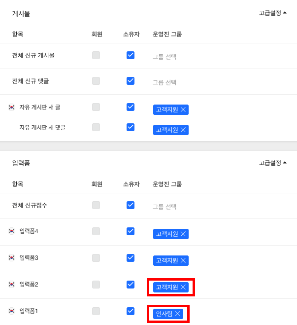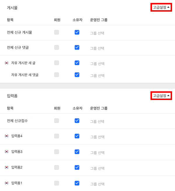 추가로, 위 4단계: 고급설정 활용하기 도움말에 따라 게시물과 입력폼 각각의 항목에 대해 회원, 소유자 뿐만 아니라 운영진 그룹으로 발송 대상을 따로따로 설정할 수도 있습니다.