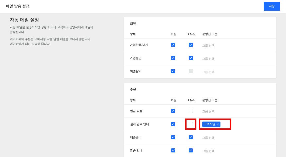 예를 들어, 신규 주문이 일어났을 때 메일 알림을 받으려면 주문 항목에서 입금 요청과 결제 완료 안내에 소유자를 각각 선택하면 됩니다.