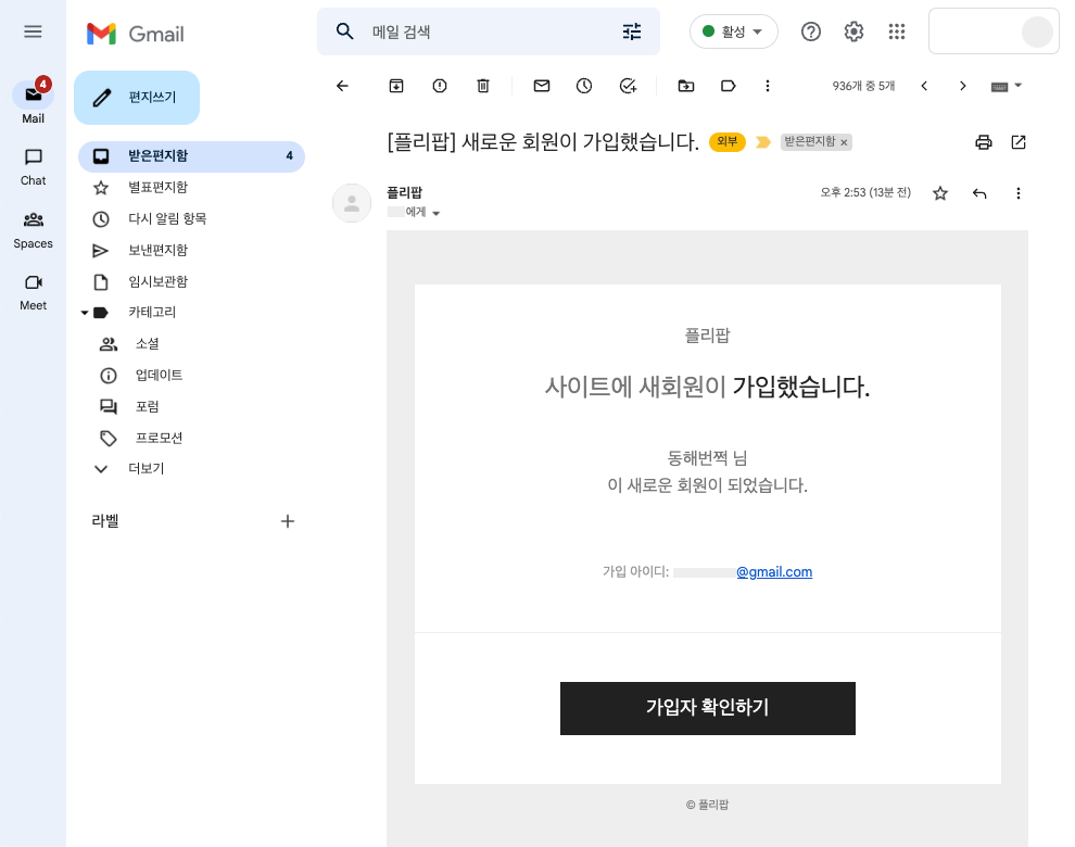 회원가입, 주문처리, 입력폼 제출, 게시판 작성 등이 일어났을 때, 소유자(운영진 그룹)에게 자동으로 메일이 발송됩니다. 아래는 회원가입이 일어났을 때 자동으로 소유자에게 발송되는 메일의 예시입니다.