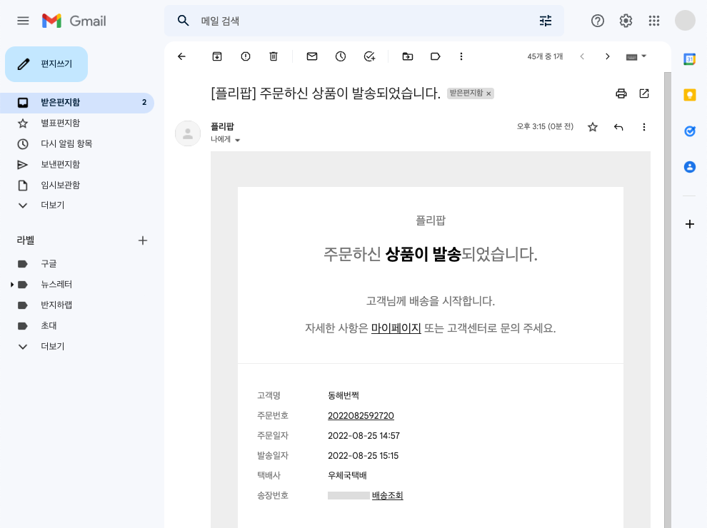 회원가입, 주문이 일어나거나, 주문 발송처리, 게시물 답변 등이 일어났을 때, 회원에게 자동으로 메일이 발송됩니다. 아래는 판매자가 상품을 발송 처리했을 때 자동으로 발송되는 메일의 예시입니다.