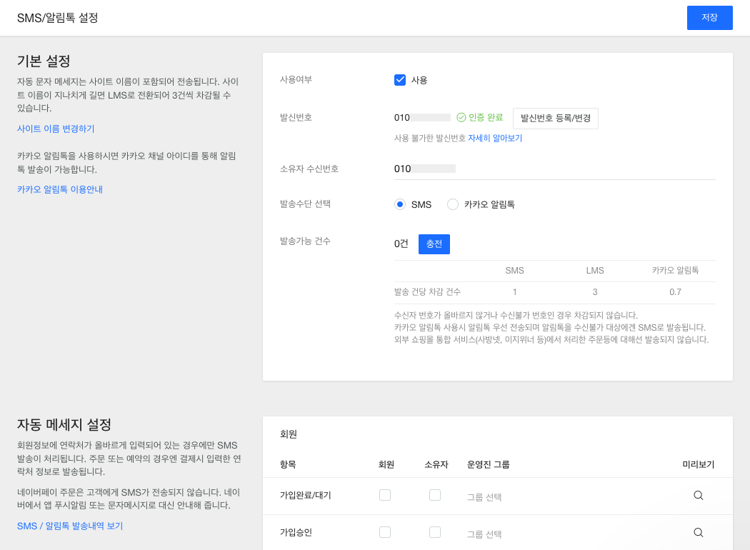 중요: 자동 SMS/알림톡의 상세 내용은 사용자가 직접 수정할 수 없으며, 네이버페이 주문은 네이버에서 대신 발송합니다.