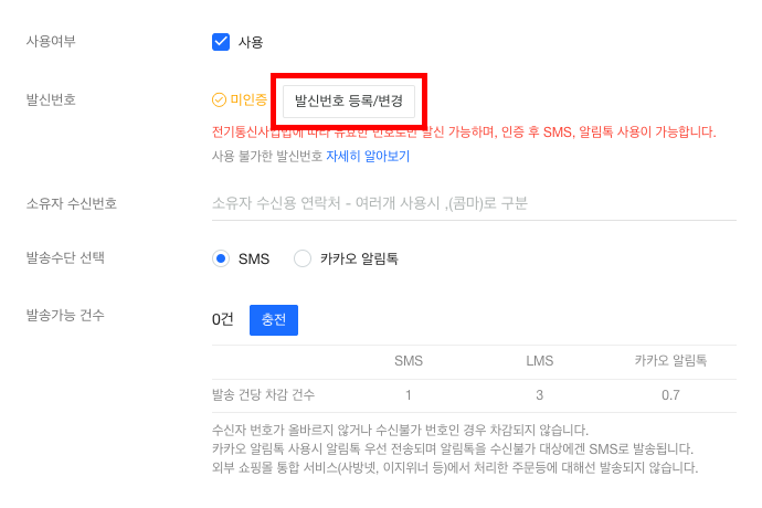 발신번호 항목에서 발신번호 등록/변경 버튼을 클릭해 인증을 완료합니다.