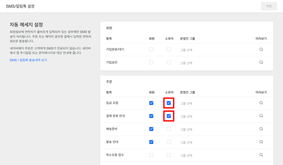예를 들어, 신규 주문이 일어났을 때 문자 알림을 받으려면 주문 항목에서 입금 요청과 결제 완료 안내에 소유자를 각각 선택하면 됩니다. 아래 그림은 실제 자동 메세지 설정 화면 예시입니다.