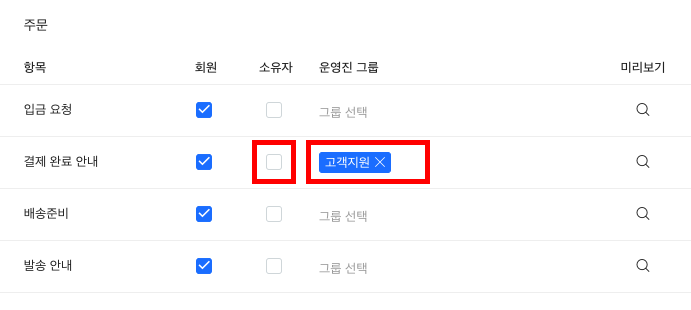 자동 문자가 특정 운영진 그룹에게 발송되도록 설정할 수 있습니다. 예를 들어, 새로운 주문이 일어났을 때 결제 완료 안내 알림 문자가 구매자와 고객지원 운영진 그룹에게만 자동 발송되도록 설정할 수 있습니다.