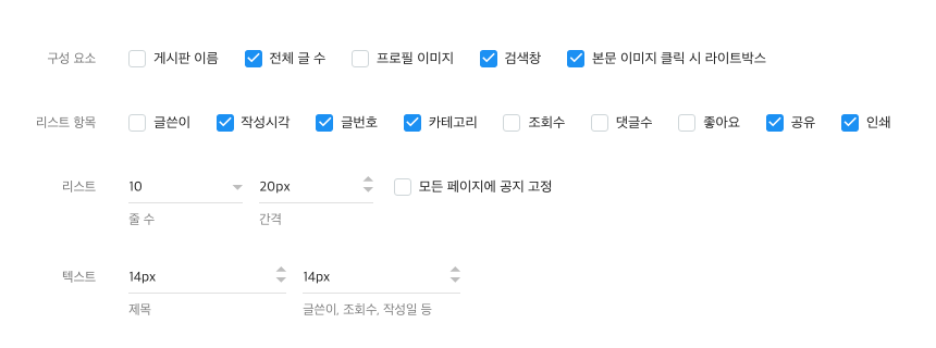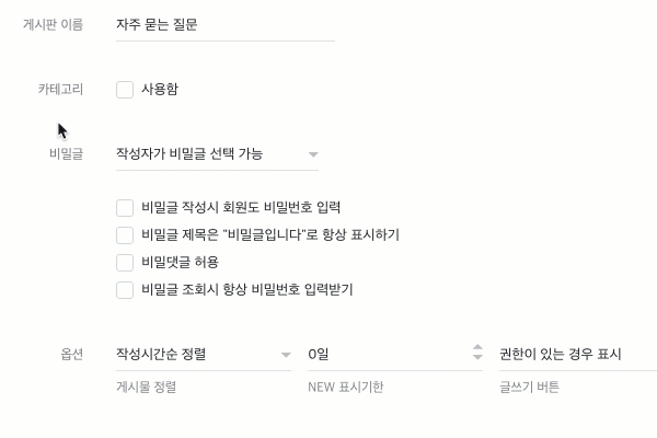 옵션 항목에서 자주 묻는 게시판 제작을 위한 필수 옵션을 설정합니다.