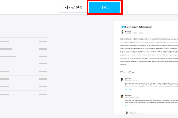 게시판 설정 창 상단의 디자인 탭을 클릭합니다.