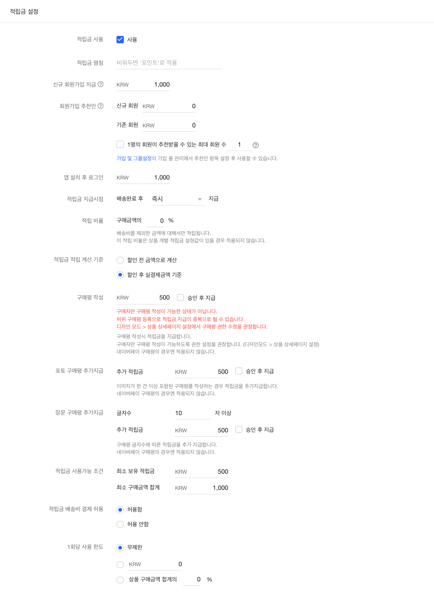 아래 내용을 참고해 적립금 상세설정을 진행합니다.